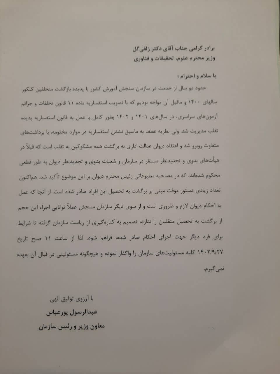 ولی نظریه عطف به ماسبق نشدن استفساریه در موارد مختومه، با برداشتهای متفاوت روبرو شد و اعتقاد دیوان عدالت اداری به برگشت همه مشکوکین به تقلب است که قبلا در هیاتهای بدوی و تجدیدنظر مستقر در سازمان و شعبات بدوی و تجدیدنظر دیوان به طور قطعی محکوم شدهاند، که در مصاحبه مطبوعاتی رئیس محترم دیوان بر این موضوع تاکید شد، هم اکنون تعداد زیادی دستور موقت مبنی بر برگشت به تحصیل این افراد صادر شده است. از آنجا که عمل به احکام دیوان لازم و ضروری است و از سوی دیگر سازمان سنجش عملاً توانایی اجراء این حجم از برگشت به تحصیل متقلبان را ندارد، تصمیم به کنارهگیری از ریاست سازمان گرفته تا شرایط برای فرد دیگر جهت اجرای احکام صادر شده، فراهم شود. لذا از ساعت ۱۱ صبح تاریخ ۲۷ آذر ۱۴۰۲ کلیه مسؤولیتهای سازمان را واگذار نموده و هیچگونه مسؤولیتی در قبال آن بعهده نمیگیریم.»