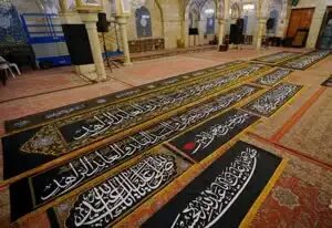 خادمان این آستان پس از آماده شدن پرچمها، درهای حرم را بسته و بدون حضور زائران بر دیوار شبستان و اطراف ضریح کتیبههایی مزین به نام و القاب امام حسین علیه السلام و شهدای کربلا نصب کردند. همچنین کتیبه «یا اباعبدالله» بالای ورودی حرم نصب شد.
