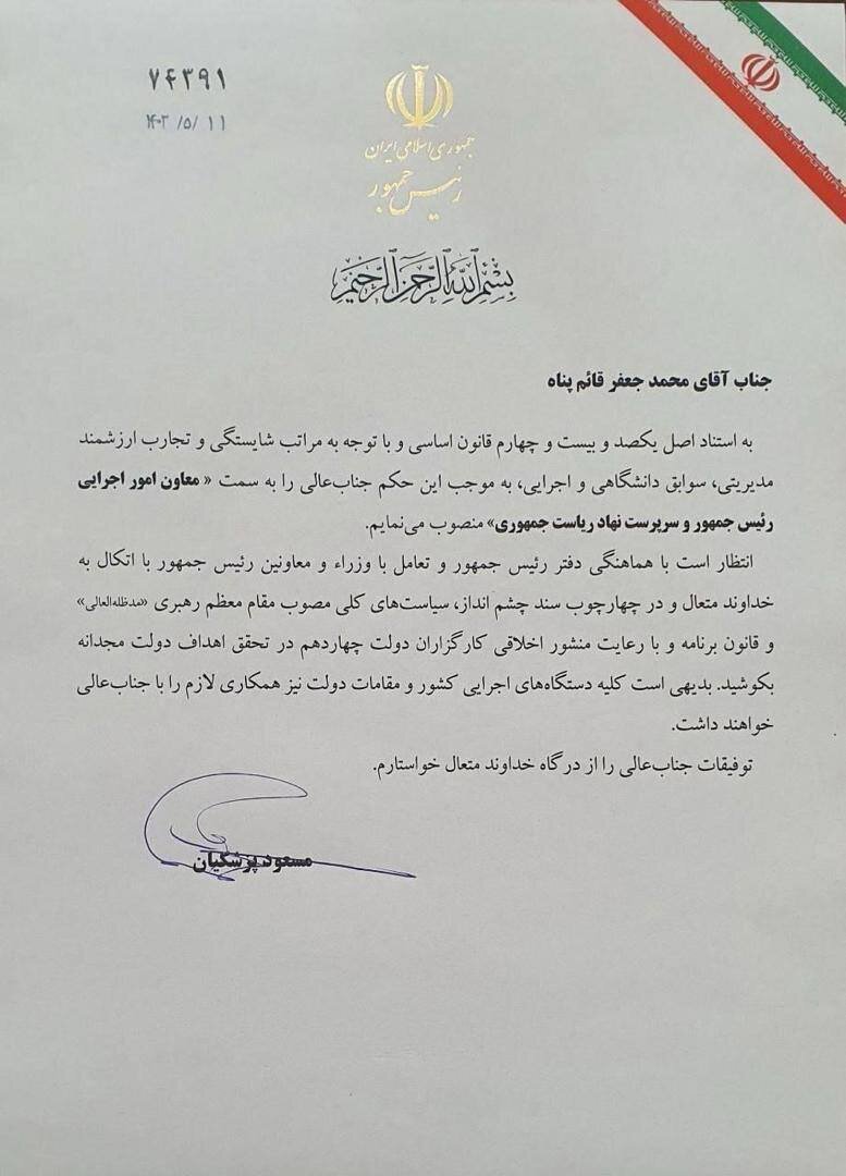 در حکم مسعود پزشکیان خطاب به محمدجعفر قائمپناه آمد است: