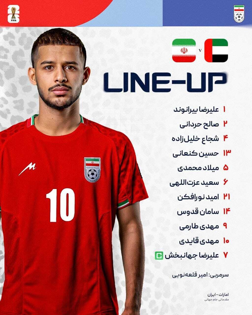 به گزارش گروه ورزشی حیات؛ امیر قلعهنویی ترکیب تیم ملی فوتبال ایران را برای بازی با امارات در دور دوم مرحله سوم انتخابی جام جهانی ۲۰۲۶ به شرح زیر اعلام کرد: