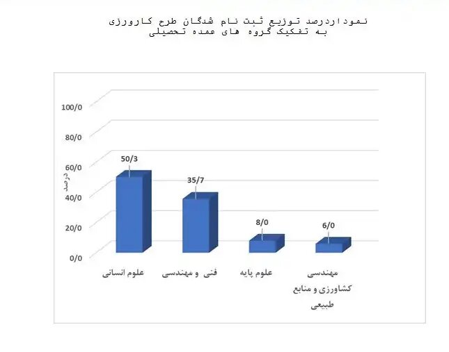 نمودارهای جدید از رصد توزیع ثبت نام شدگان طرح کارورزی بیانگر این است که متقاضیان کارورزی در رشته های علوم انسانی, فنی و مهندسی, علوم پایه و مهندسی کشاورزی و منابع شرکت کرده اند. همچنین ۱۴.۱۱ درصد متقاضان کارشناسی ارشد، ۰.۲۱ درصد دکترا و ۵.۰۲ درصد کاردانی، ۰.۰۳ درصد حوزوی و ۸۰.۶۴ درصد کارشناسی بوده اند.