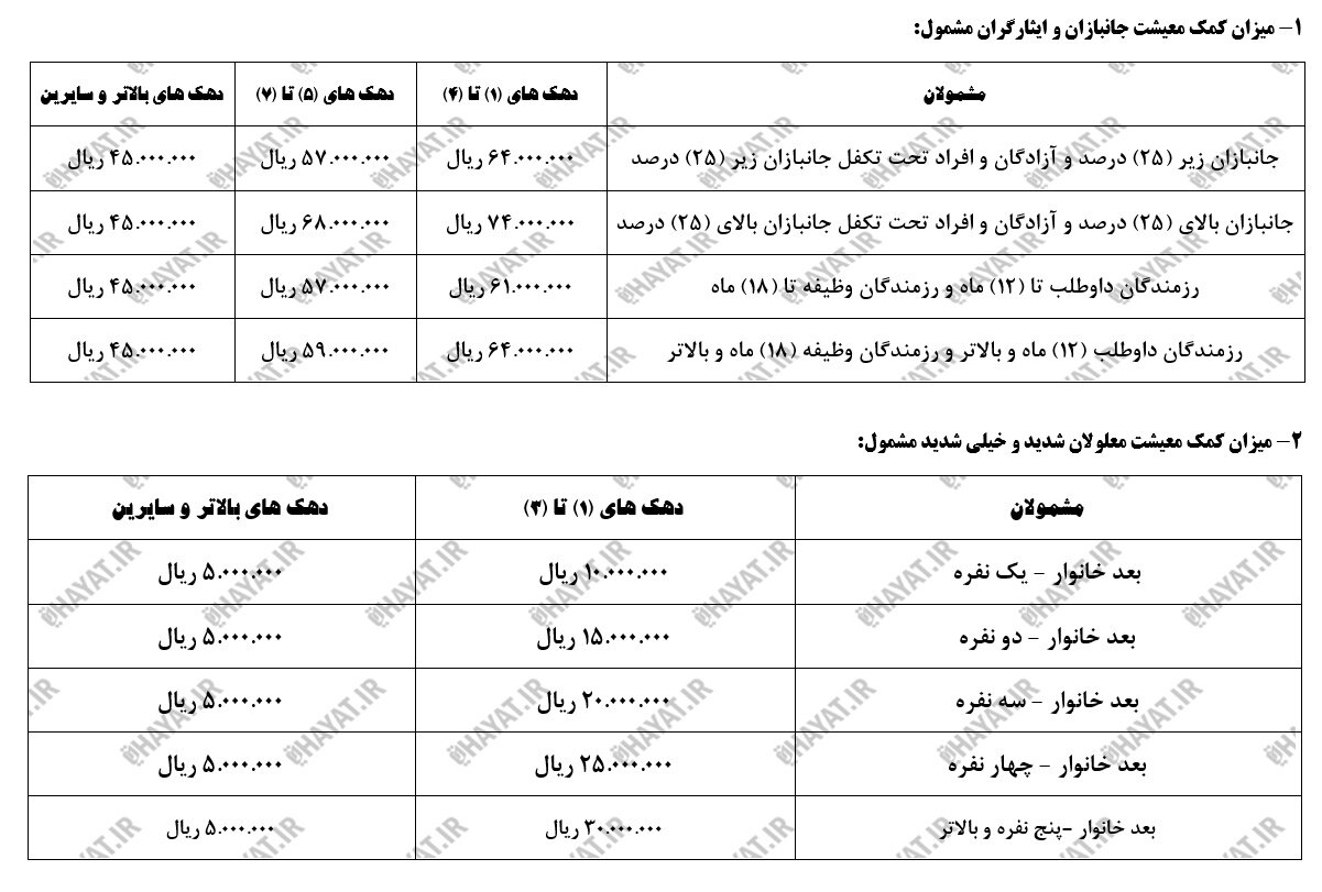 ماده ۶: کمک معیشت پرداختی به مشمولان بر اساس جدول زیر تعیین خواهد شد: