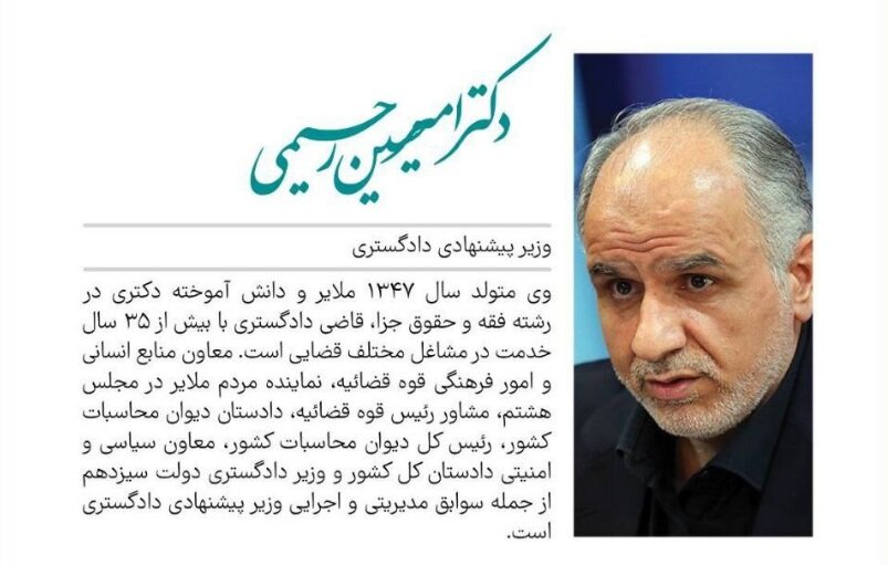 امین حسین رحیمی، که هم‌اکنون به عنوان وزیر دادگستری در دولت سیزدهم جمهوری اسلامی ایران فعالیت می‌کند، دارای سوابق متعددی در حوزه قضایی و تقنینی است. از جمله:رئیس دیوان محاسبات کشور،معاونت حقوقی و پارلمانی دیوان عدالت اداری،قاضی دیوان عدالت اداری، نماینده مجلس شورای اسلامی،عضو هیئت علمی دانشگاه، مشاور حقوقی