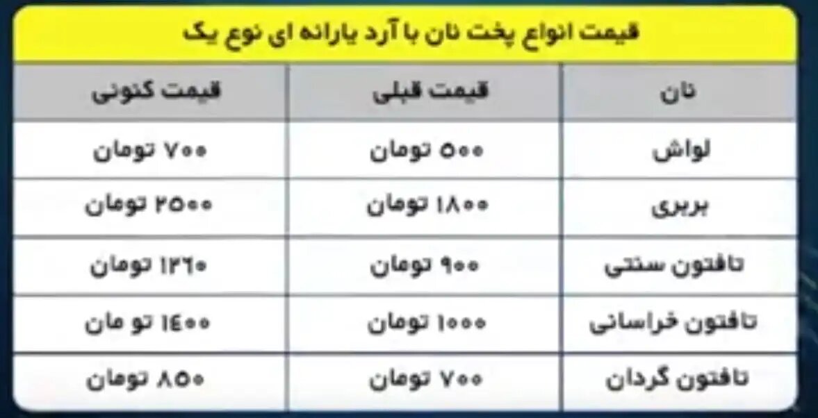 وی ادامه داد: نان لواش با آرد نوع یک از پانصد تومان به هفتصد تومان تغییر قیمت یافت و لواش نوع دو نیز از ششصد و پنجاه به نهصد تومان رسید.